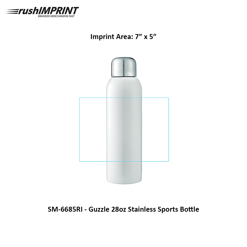 The Guzzle 28oz Stainless Sports Bottle features single-wall construction and stainless steel screw-on lid. Hand wash only and follow any included care guidelines. Material: Stainless Steel. Price includes one color, one location imprint.