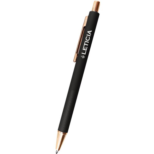 Plunger Action. Unique Grip Design.Aluminum Pen. Trendy Rose Gold Accents. Price includes one colour, one location imprint.