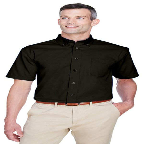 Fabric: 4.5 oz/yd2, 155 gsm. 55% cotton, 45% polyester twill. Wrinkle-resistant and stain-release fabric. Feature: Extra stitching at seams and buttons. Flat-felled seam finishing. Signature horn-style buttons with Harriton logo. Hemmed short-sleeves. Button-down collar. Left-chest pocket. Full back yoke and back pleat. Deco Eligible. Price includes embroidery.