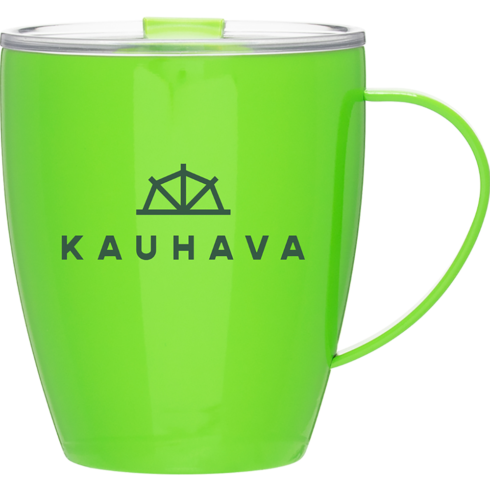 12 oz double wall 18/8 stainless steel thermal mug with copper vacuum insulation, clear acrylic push-on lid, and matching swivel - gift box included. Price includes one colour, one location imprint.