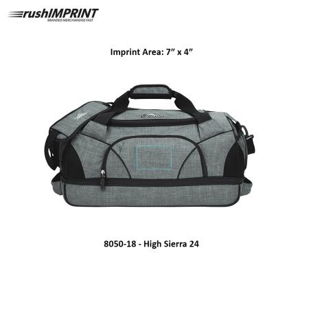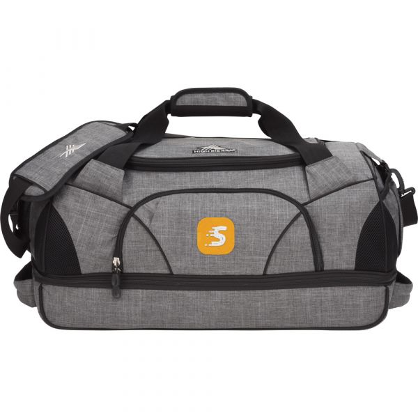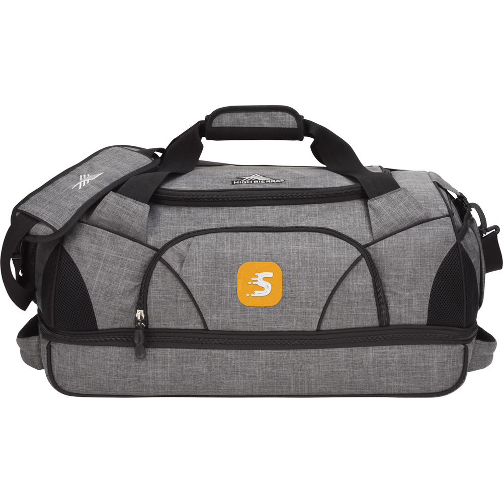 Zippered main compartment with U-shaped opening. Drop-bottom wet compartment with zippered divider panel opens to make one large compartment. Front pocket with deluxe organizer and headphone port. Water bottle and accessory pockets. Includes lifetime warranty. Material: 600d PolyCanvas.