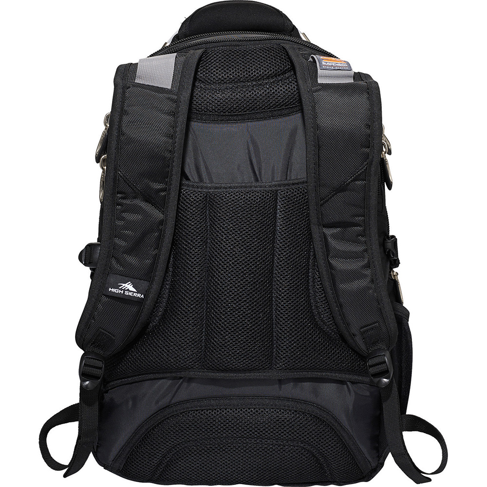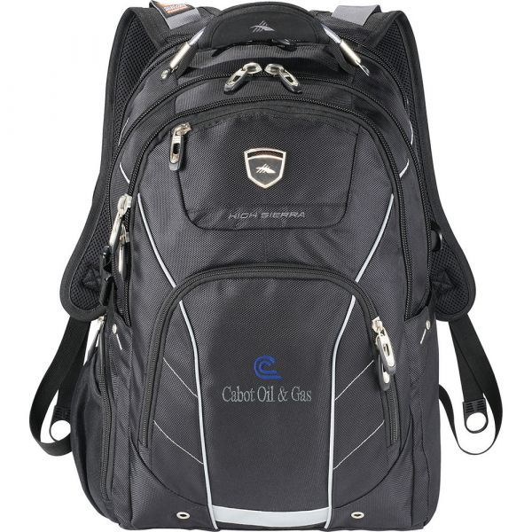 The High Sierra Elite Fly-By 17" Computer Backpack features a checkpoint-friendly laptop compartment to make airports a breeze. Offering a large, multi-compartment design. it also features a Cushion Zone padded computer compartment; an adjustable sling system in the laptop compartment that protects up to 17 inch laptops and a dedicated Tech Zone for your iPad or other tablet. Comes with an organizer compartment with a mesh pocket, pen pockets and a key fob, plus multiple side pockets, an easy-access media player pocket and a front zippered accessory pocket. Yoke-style, S-shaped Vapel mesh padded shoulder straps with Collar Comfort edge, Comfortable Vapel mesh padded back panel with Airflow and trolley pass-through. Includes lifetime warranty. MATERIAL: 600d PolyCanvas. Price includes embroidery one location up to 10,000 stitches.