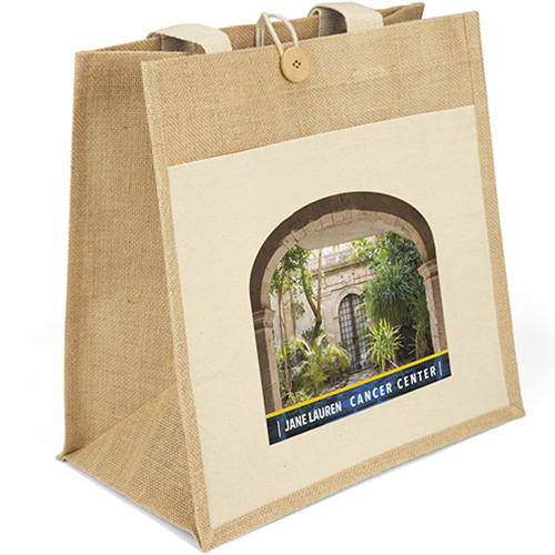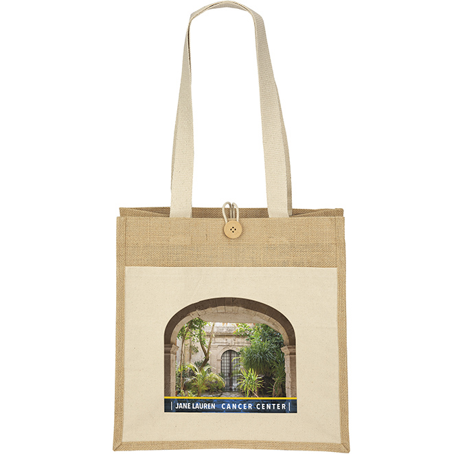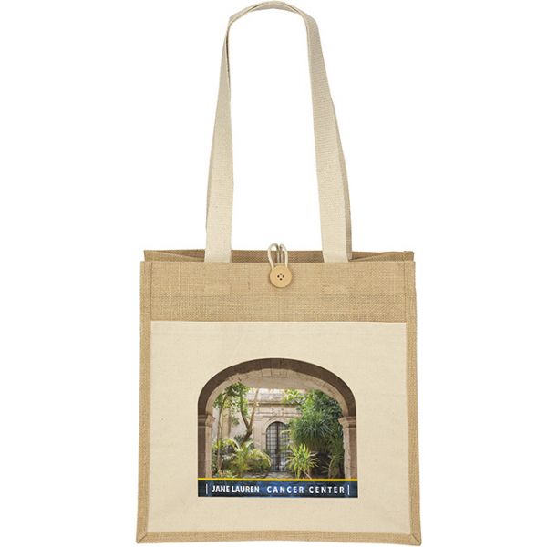 Stylish and strong enough to hold up to heavy loads, the reusable Izzy Tote features a natural-colored jute exterior with a 10-oz. cotton front pocket and a laminated interior. Features wooden buttons with loop closures and 1 1/4"- wide x 28"-long cotton twill handles.