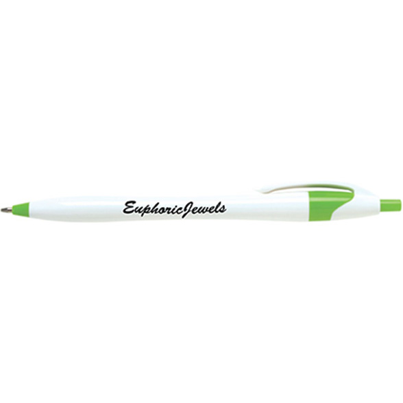 Plastic push-action retractable ballpoint pen. Crisp white with bright accents. Uniquely shaped body fits comfortably in your hand. Ultra-smooth writing cartridge. Bulk packed. Available in Black or Blue ink. Price includes one colour, one location imprint.