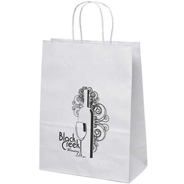 This popular white kraft-paper shopper is functional, affordable, and includes matching twisted paper handles and serrated cut top. Price includes one color, one location imprint.