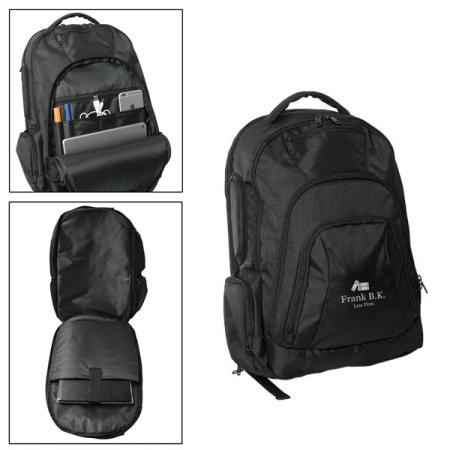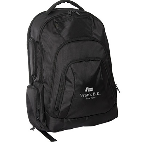 1680D Polyester. Main compartment with zippered closure. Back zippered padded laptop compartment with hook and loop fastener. Designed for laptops up to 15"-17". Front zippered pocket and separate front zippered pocket multi pocket organizer. Front top zippered valuables pocket. Mesh pocket on one side and two zippered pockets on the other side. Padded adjustable/non-detachable comfort backpack straps. Padded top carry handle. Contents not included. TSA friendly. Unzips fully to lay flat so your laptop does not need to be removed from bag when going through airport screening. Price includes one colour, one location imprint.