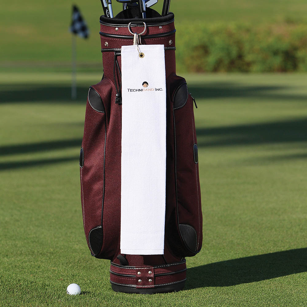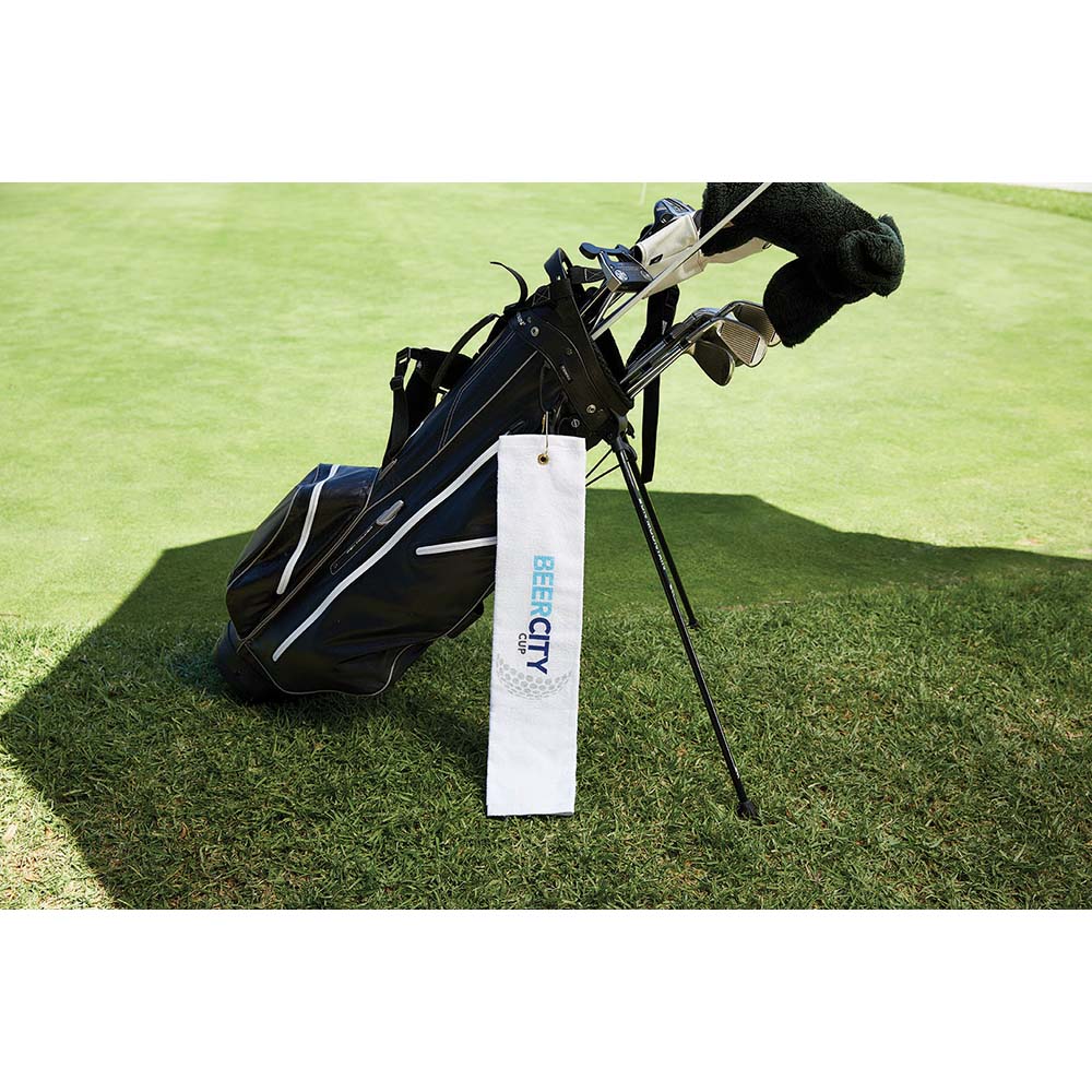 Dry your golf gear in style with this absorbent, 100% cotton terry velour towel. Perfect to promote company and golf events. Easy to hang on your golf bag with the included tri-fold grommet.