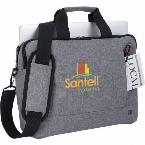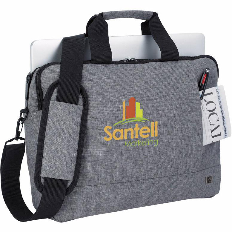 This modern and subtle briefcase is ideal to carry your laptop and other important documents while you are traveling. Zippered main compartment with padded laptop sleeve. Front zippered compartment with business card and pen slots. Exterior vertical zippered pocket for additional storage. Adjustable and removable padded shoulder strap. Part of the Pierce collection. Price includes one colour imprint, one location.