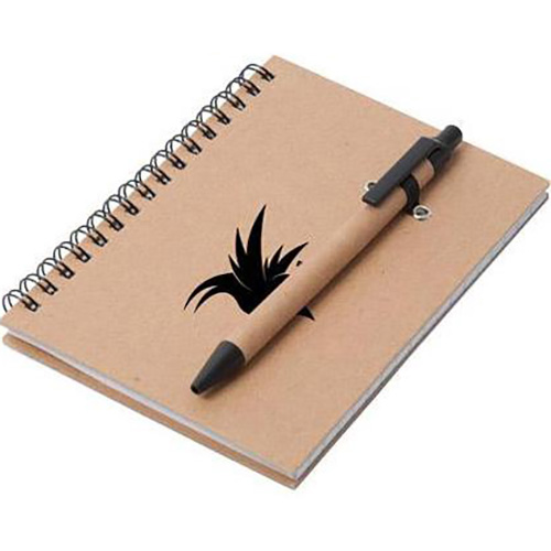 Recycled Cardboard. Hard cover notebook includes 50 – 80 grams sheets lined white recycled paper. Spiral binding. Matches CA8361 pivot pad and CA5988 notebook. Elastic pen loop on front cover. PE4772 pen included. Price includes one colour, one location imprint.