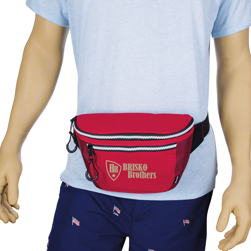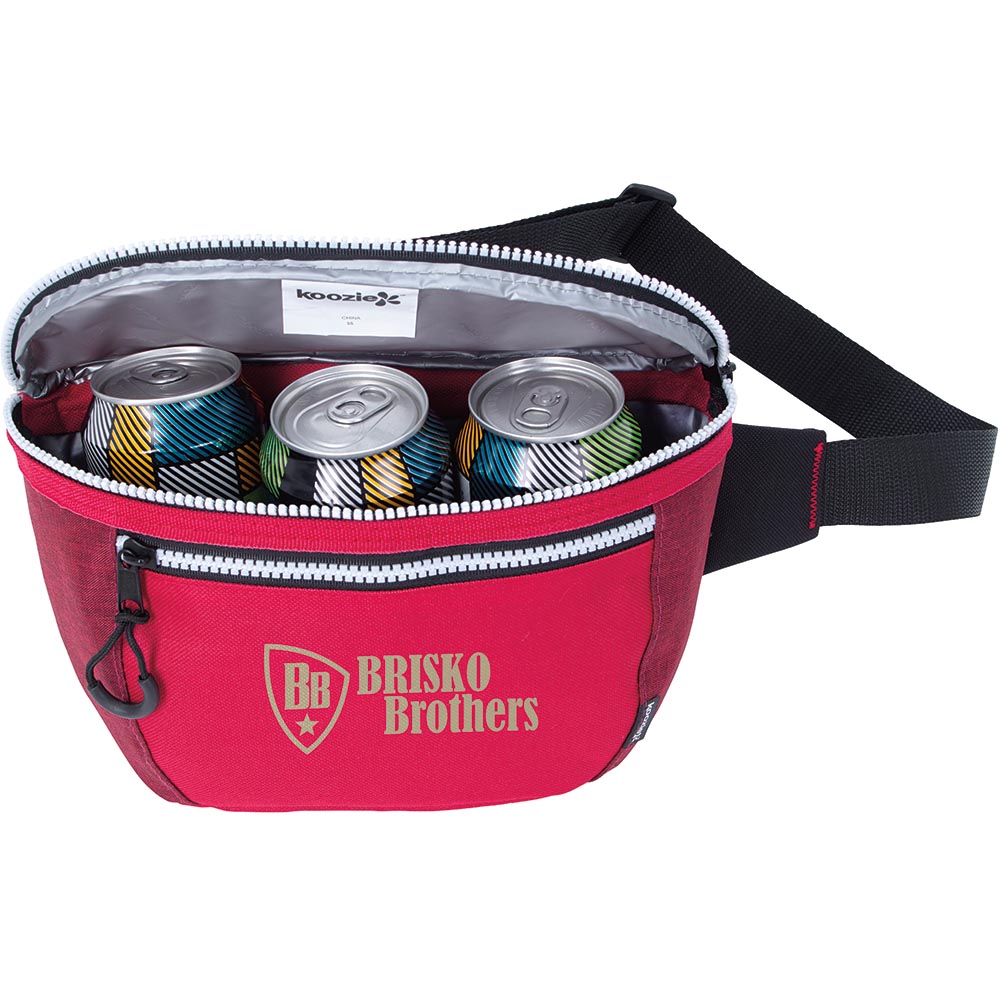 Keep your drinks cool while also looking cool in this insulated fanny pack! Main zippered compartment. Front zippered pocket. Adjustable waist strap with buckle closure. Heat-sealed PEVA liner. Keeps cool with ice packs. Price includes one color, one location imprint.