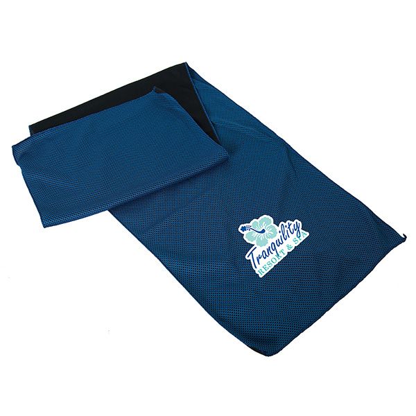 Breathable extremesoft cooling material. 2-layer cooling towel with zig-zag stitching. Lightweight and reusable. Material retains moisture while remaining dry to the touch. Once this towel is damp it helps lower your body temperature. Cools you down and absorbs sweat without dripping. Provides a refreshing way to help cool down. Can be used over and over again. Just re-wet and ring out to reuse. Great for the gym, cardio classes, walks, hikes and outdoor sports. Instructions included. Machine wash in gentle cycle; hang to dry. Price includes one colour, one location imprint.