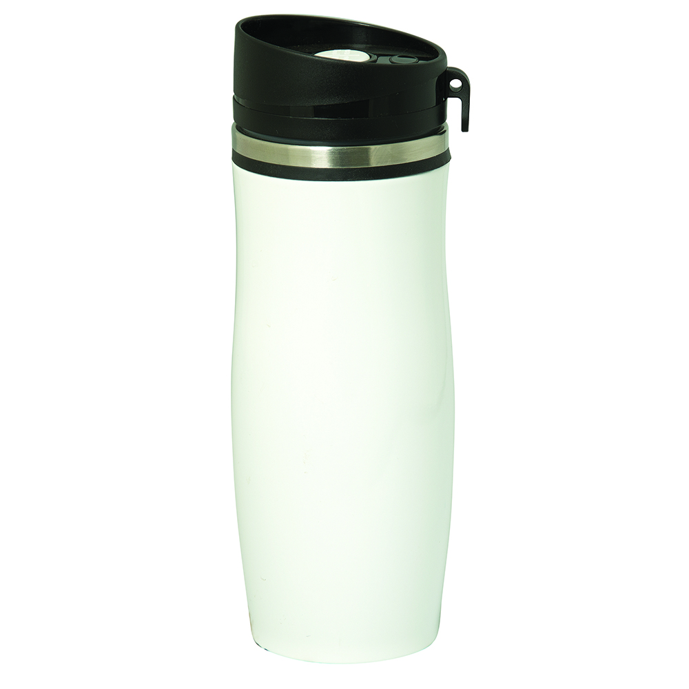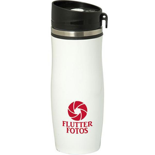 18/8 Stainless Steel exterior with 18/0 Stainless Steel interior. Double walled with vacuum insulated. Black Silicone ring. Holds up to 400 ml. (13.5 oz.). Individually boxed. FDA compliant and BPA free. PP twist on/off lid. Push button open/close lid. Leak proof. Price includes one colour, one location imprint.