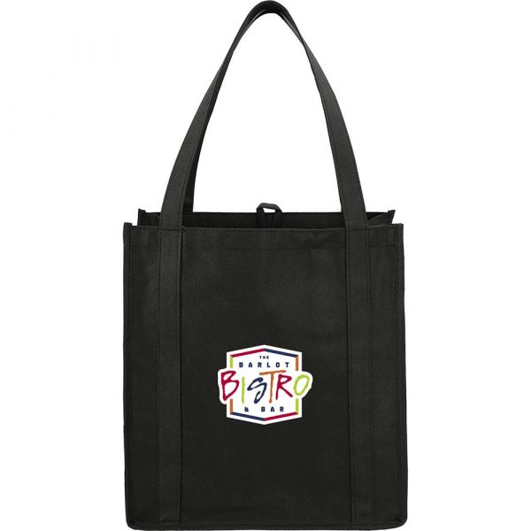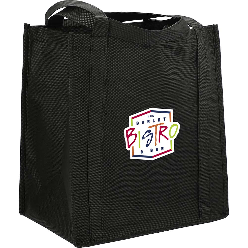 The Little Juno Non-Woven Grocery Tote features an open main compartment with double 22 inch reinforced handles and a supportive bottom board. It's also reusable and a great alternative to plastic bags. Gusset & Handle Decorating does not qualify for one day turn. Material: 80g Non-Woven Polypropylene.