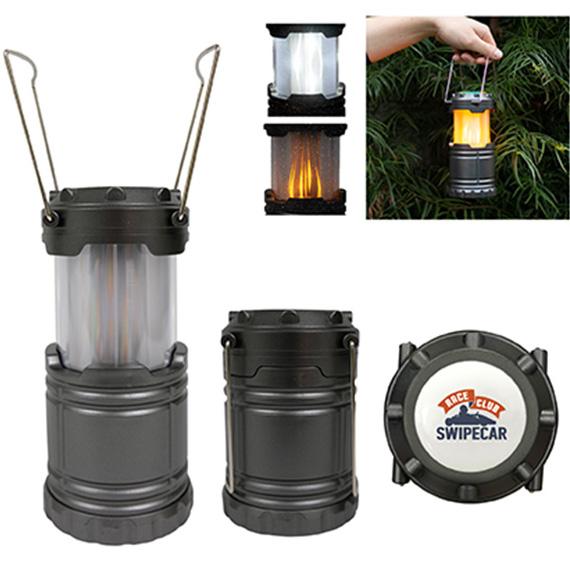 Plastic. COB LED technology Chip On Board. Looks like a lighting panel with multi LED lights packaged together. 300 lumens brightness. Pull up to turn on. Close and open again for a different type light. You can have it as a bright lantern or a replica camp fire. 3 AA' mercury-free batteries (included/not inserted). Two wired carry handles/hangers. Extends up to 7.375" high. Use while camping or while on your deck or patio. Instructions included. Individually boxed. Looks like a mini replica lantern. PAD 1C HD READY 1.5" W x 1.5" H (top). PAD 1C 1.25" W x 0.75" H (front/back). Price includes one colour, one location imprint.