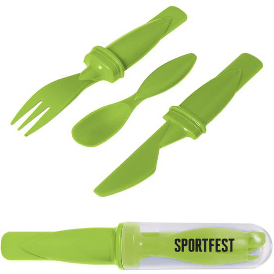 ABS cutlery and PP Plastic case . Cutlery set includes fork, spoon and serrated knife. Cutlery packs inside protective carrying case. Reusable and easy to clean. Great for camping and lunches. Dishwasher safe. Price includes one colour, one location imprint.