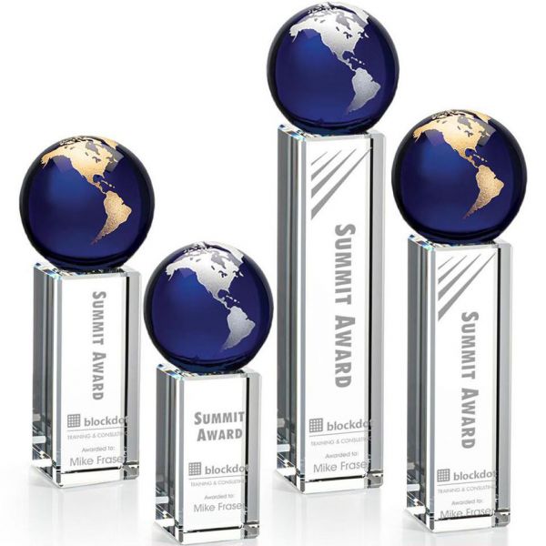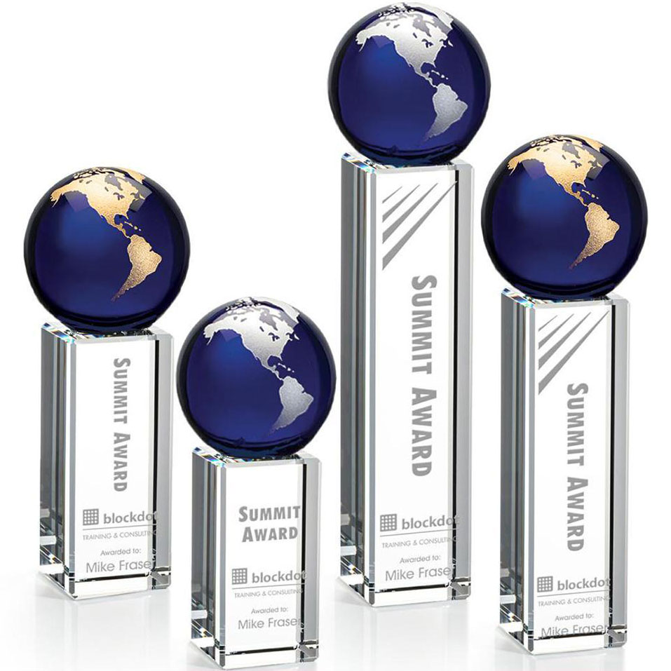 The Luz Globe award features a Blue Optical Crystal globe perched on an Optical Crystal pillar. Available in gold or silver. Price includes laser engraving.