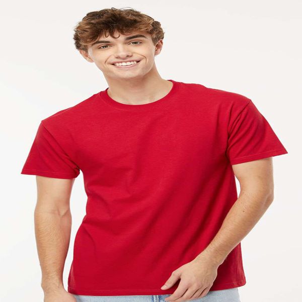 5 oz./yd2 (US) 8.1 oz./L yd (CA)., 100% cotton preshrunk jersey, 23 singles. Ash is 99/1 cotton/polyester. Athletic Grey is 90/10 cotton/polyester (US only). Sport Grey is 90/10 cotton/polyester (CA only). Heather & Safety colors are 50/50 cotton/polyester. Taped neck and shoulders. Double-needle sleeve and bottom hem. Double-needle cover seamed neck. Tubular construction. Quarter-turned body. Tear away label. USMCA Certified. Prices includes one colour, one location imprint.