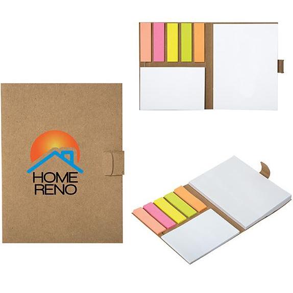 Kraft paper cover. Paper tab closure. Includes a total of 175 sheets of sticky notes of 80 GSM paper - 50 sheets 3" x 4" white sticky notes - 25 sheets 2" x 3" white sticky notes - 20 sheets each of light pink, pink, yellow, green and orange sticky note flags. One book to hold all of the different sized sticky notes that you need. The perfect product for schools and offices. Price includes one colour, one location imprint.