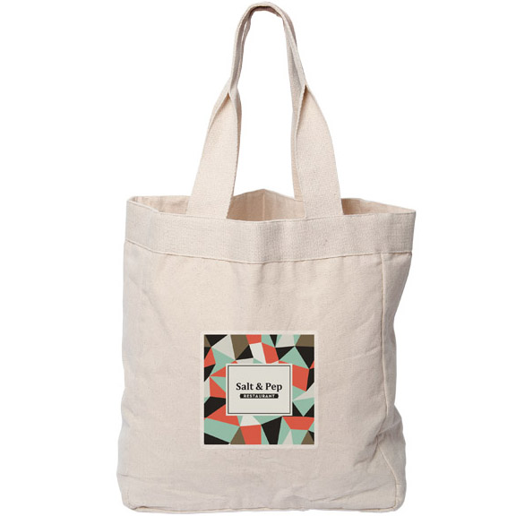 12 ounce Cotton. Two webbed carry handles/straps.Two inside pockets sized at 8" W x 13" H