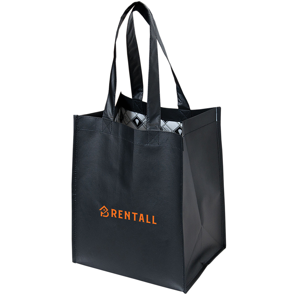 Personalized tote bag made of non woven 140 gram double laminated polypropylene with matte finish. Product dimension: 11.75" x 9.5" x 7.25" - 0.154 lbs. Fully preprinted interior as illustrated. Matching non woven laminated cross-stitched handles. Practical mid-sized tote bag for smaller items, a night out or a gift bag. Imprint dimensions: 6"x6". Price includes one colour imprint, one location. Select from 7 bright product colours. A minimum of 2500 custom tote bags in 1 day of production. Free samples and art proof.