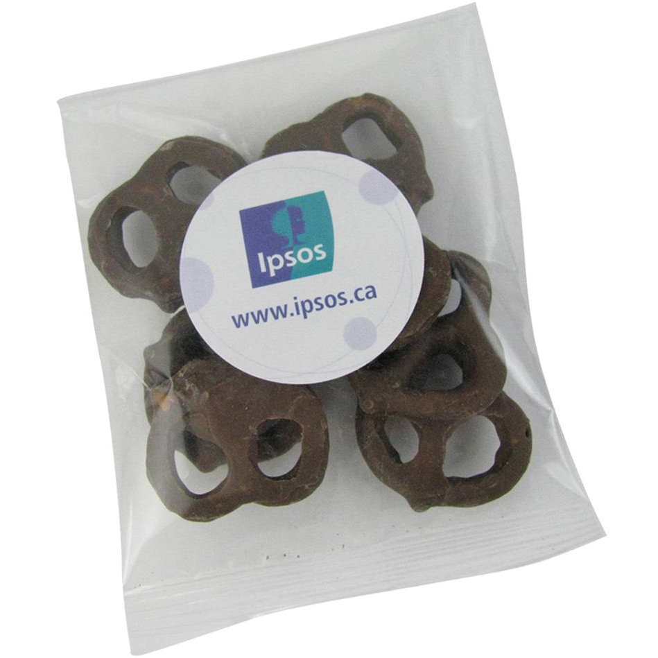 1oz. Milk Chocolate Mini Pretzels Goody Bag. Perfect for parades, trade shows or any event where you want to give an inexpensive, colorful and delicious treat. Labeled bag dimensions: 3" x 4". Non melt product.