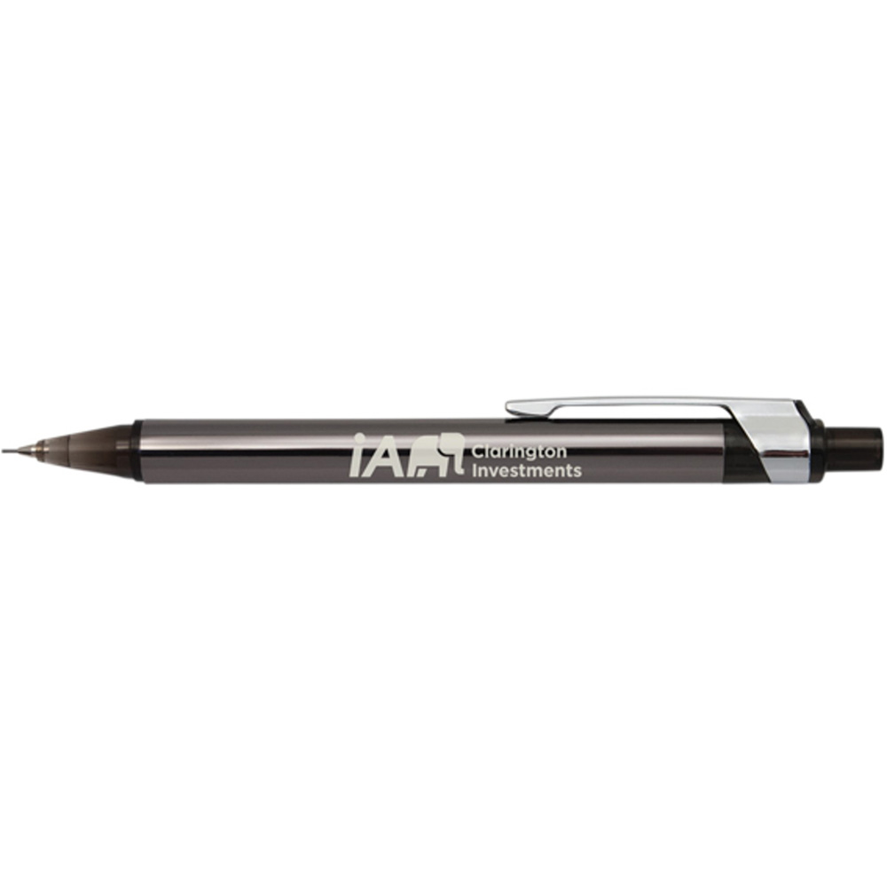 Aluminum body mechanical pencil with plastic tip and push action button. 0.7mm pencil lead.See 1902 for matching pen. Poly bag. Material : Aluminum. Price includes one color, one location imprint.