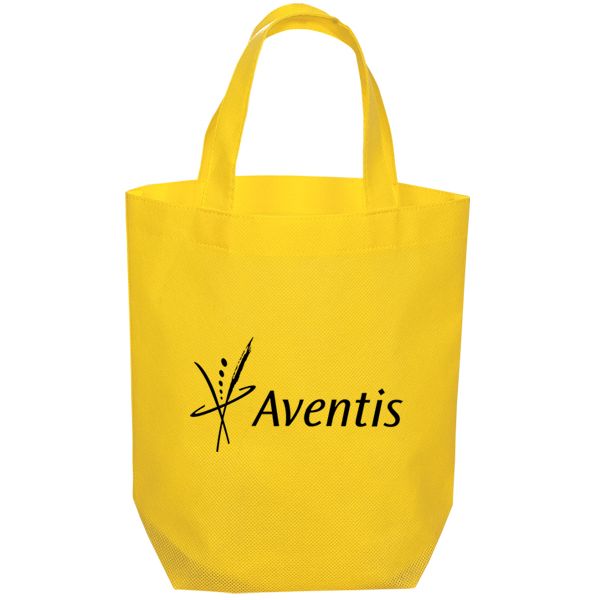Non woven 90 gram polypropylene. Self-material handle. Handy mini sized tote bag for your lunch, make-up, a night out, or as a gift or loot bag.