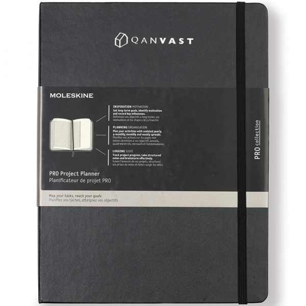 The Pro Project Planner is an undated diary/planner that allows you to set the pace and reach your goals throughout the year. Although the dates are left blank, it is structured in such a way as to invite you to set long-term goals, identify motivation and document key milestones. There are yearly, 4-monthly, monthly and weekly sections for you to personalize and map your time, as well as a project progress section for structured notes and effective brainstorming. The Pro Project Planner has 3 sections, each one dedicated to a specific purpose. 1.) INSPIRATION: Set long-term goals, identify motivation and record key milestones. The intro pages invite you to work out your objectives for the year and take note of the people and places who inspire you day-to-day. This section grows throughout the year as you gradually add key moments and accomplishments. 2.) PLANNING: Plan your activities with undated yearly, 4-monthly, monthly and weekly spreads. The year, month and dates are left blank on the planning pages, giving you the freedom to start the planner whenever suits you. Map out a 12-month overview and 4-month plans, before breaking your tasks down into more detailed monthly and weekly sections. 3.) LOGGING: Track project progress, take structured notes and brainstorm effectively. The logging pages are about getting stuff done and rooting out ideas. Plan and track each stage of individual projects on the project progress pages. The notes pages are structured to help you focus your thoughts, while the brainstorming section helps guide the way you expand and explore ideas. Bound hard cover with rounded corners, 3 ribbon bookmarks and elastic strap closure. 180° lie-flat opening. Ruled format. Ivory colored 70 g/m2 acid-free paper. Expandable inner pocket. 288 pages (144 sheets). FSC Certified. Notebooks come packaged with a Moleskine retail paper band and are individually shrink wrapped. Add a Custom Band (Item # 346), see link below! Price includes one color, one location imprint.