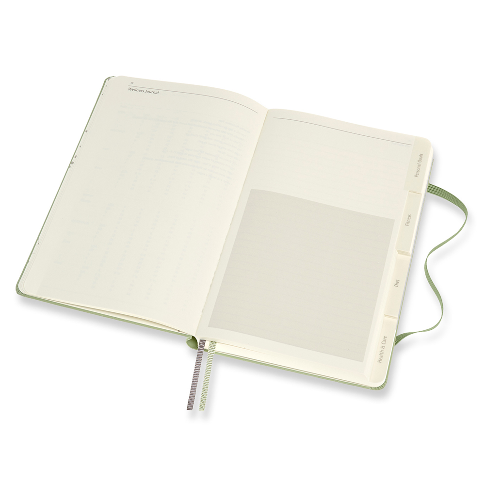 The Wellness Journal is designed to grow into a permanent and uniquely customized record of your fitness, nutrition and wellness journey, tracking all your healthy lifestyle goals along the way. The intro pages are full of nutrition tips, exercises to increase muscle mass and practical fitness facts, while four dedicated and structured sections allow you to divide your progress between Personal Goals, Fitness, Diet, and Health & Care. Plain pages at the back make space for extra notes or inspiration. 2 ribbon bookmarks. Double expandable inner pocket. Ivory-colored 70 g/m² acid-free paper. Tabbed sections to guide your note-taking. Themed introductory pages. 400 pages. Themed stickers to customize your journal. Product comes packaged in a Moleskine gift box (Notebook will not include a Moleskine branded ivory paper band and will not be shrink wrapped) Price includes one color, one location imprint.