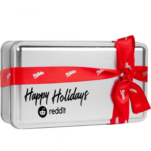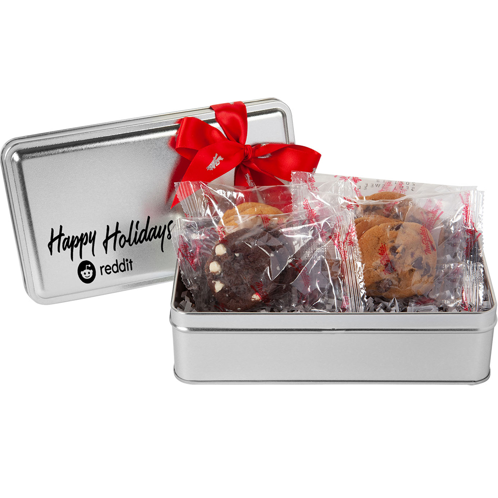 Our festive cookie tin is filled with (4) 3 packs of freshly made Mrs. Fields Cookie Nibblers with a selection of Mrs. Fields best sellers! Our Holiday Variety Cookie tin includes semi-sweet chocolate chip, white macadamia nut and triple chocolate cookies for your customer's delight. Comes with a customizable lid and a Mrs. Fields hand-tied ribbon. Price includes one color, one location imprint.