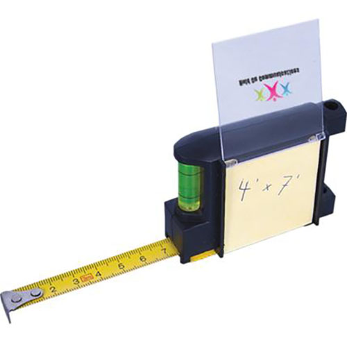 ABS Plastic. Unique design comes complete with: 10' tape measure with built-in level, pen, and sticky notes. Comes with metal belt clip. Individually boxed. Price includes one colour imprint, one location.