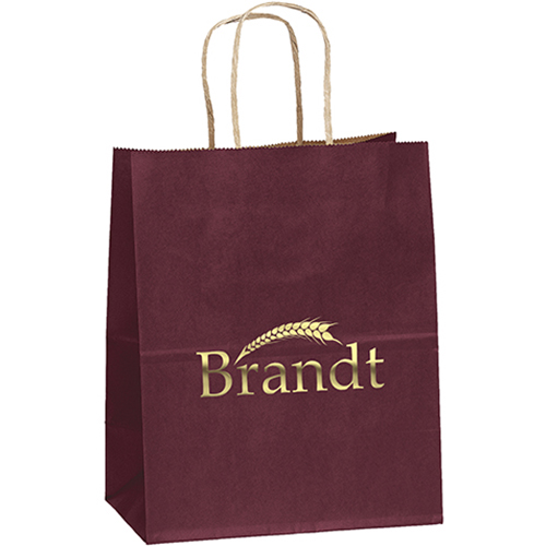 This affordable matte paper shopper includes a serrated cut top and twisted kraft paper handles. Price includes foil stamp.