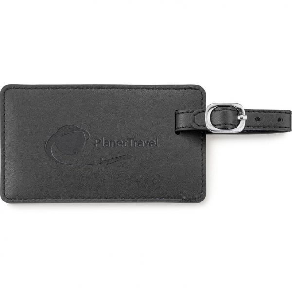 Standard: Bulk. Easily identify your bag when you attach this matte metallic vinyl Neoskin luggage tag. The buckle and strap closure will ensure that this tag is securely fastened. Simply insert a standard business card or fill out the information card included. Price includes debossing.