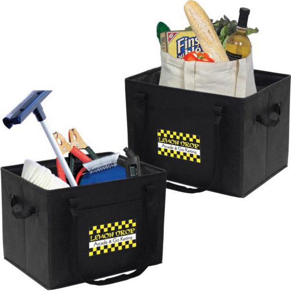 Non woven 100 gram polypropylene. One set of short webbed handles and one set of webbed long handles. Black metal hardware. Front slash pocket. Folds easily for storage. Go straight from the grocery cart to the trunk. Contents not included. Price includes one colour, one location imprint.