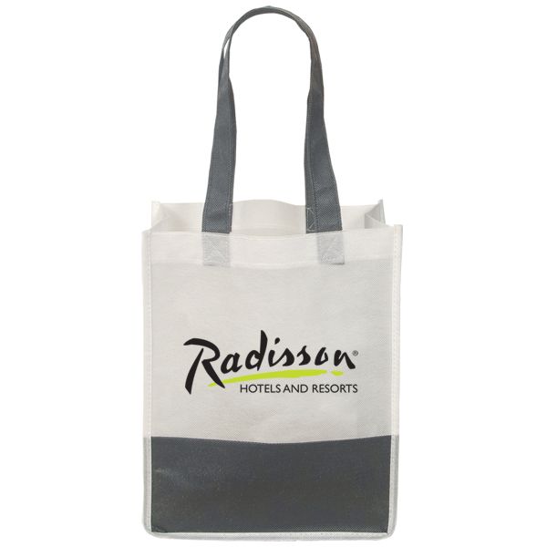 Non woven 75 gram polypropylene. Two matching coloured self material handles. Coloured bottom ‘stripe’ design. Imprinting available in the middle or along bottom.
