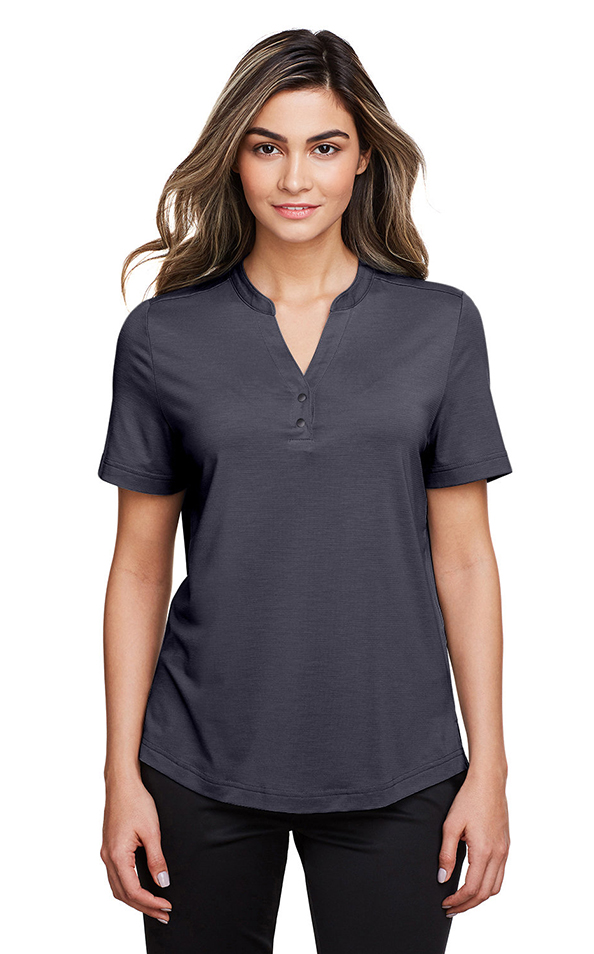 Fabric: 5.3 oz/yd2 / 180 gsm, 69% polyester, 26% lyocell 5% spandex jersey. Moisture-wicking and antimicrobial performance. The fiber lyocell from Lenzing is a sustainably sourced, renewable and bio-degradable botanic fiber. Feature: Henley placket with metal two-snap closure. Side vents. Hi-low hemline. Stretch performance. Active fit. Easy care. Deco Eligible. Price includes embroidery.