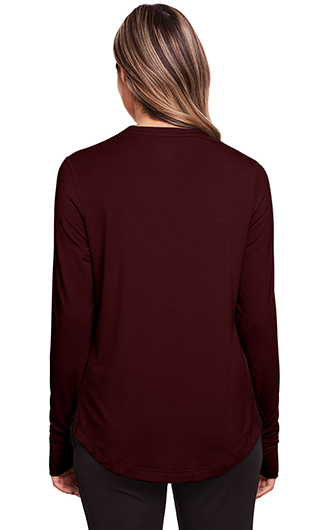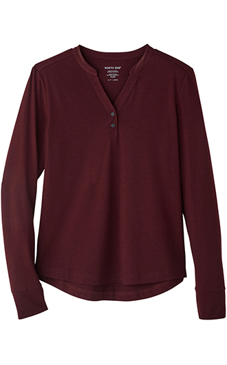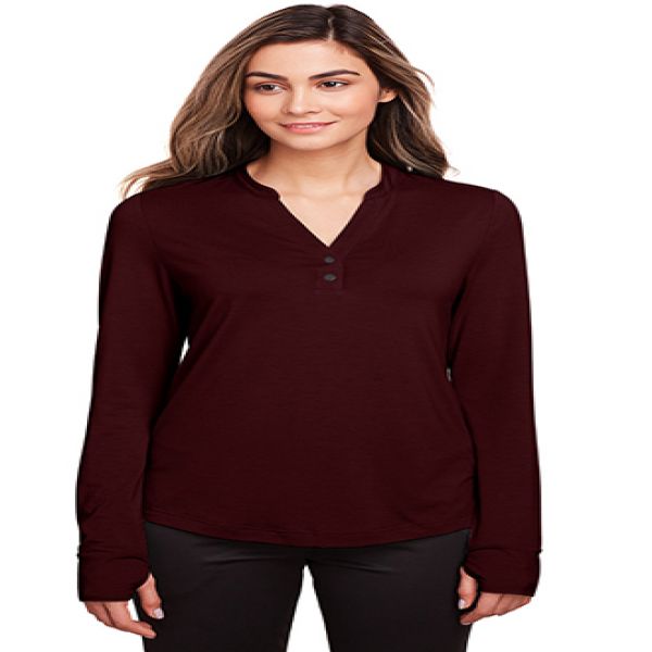 Fabric: 5.3 oz/yd2 / 174 gsm, 69% polyester, 26% Lyocell 5% Spandex jersey. Moisture-wicking and antimicrobial performance. Feature: Henley placket with metal two-snap closure. Self-fabric cuffs with integrated thumbholes. Hi-low hemline. Side vents. Stretch performance. Active fit. Easy care.