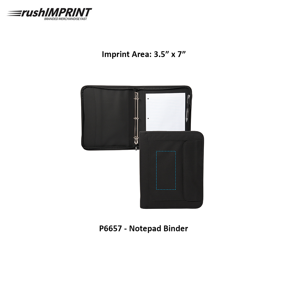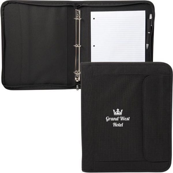 600D Ripstop Polyester. 1.5" non-removable O' ring binder. Inside slash pocket. Front hook and loop fastener gusseted pocket. Three-sided zipper closure. Paper pad and PE8605 stylus pen included. No extra charge to insert your own pen, click on Decorating info' for more information. Price includes one colour, one location imprint.