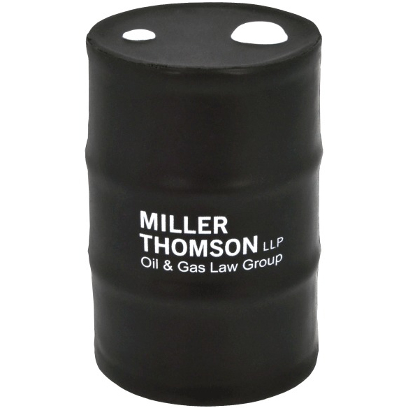 Custom stress ball in black colour and shaped like an oil drum. Product dimensions: 3"x 2"- 0.1 lbs. Squeezable foam in polyurethane material. Imprint dimensions: 1.25" x 0.5". Price includes one colour imprint. At least 150 personalized stress balls. Free art proof. In 7 days of production. No duties, no fees!