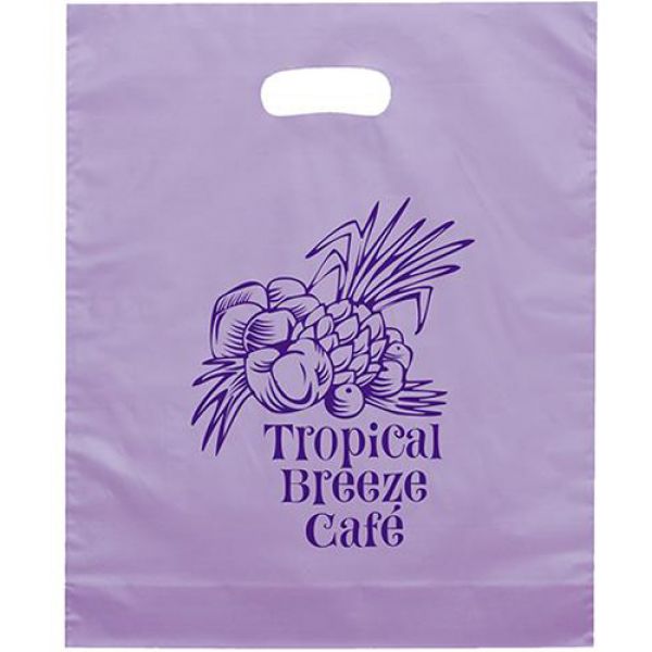 Dress up your next promotion with this colorful hi-density 2.5 mil frosted plastic bag. This die cut handle bag features a bottom gusset. Price includes foil stamp.