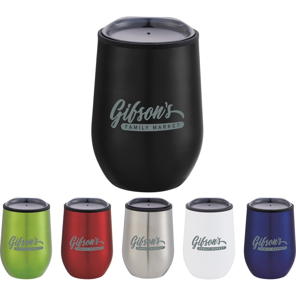 The Osborn 10oz Cup features double-wall construction and a push-on lid with a drink opening. Perfect accessory for wine. Hand wash only and follow any included care guidelines. Material: Stainless Steel with Plastic Liner. Price includes one color, one location imprint.