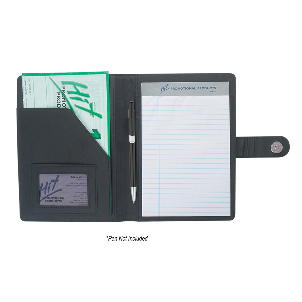 Includes 30 Page 5" x 7" Writing Pad. Snap Closure. Elastic Pen Loop, Inside Flap Pocket And Mesh ID Holder.