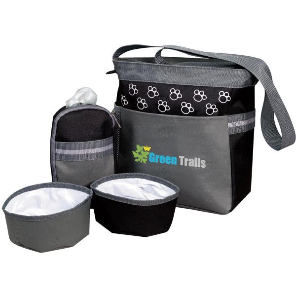 This pet accessory bag is perfect for walks in the park, backyard or beach! Includes 2 collapsible bowls for food and water. Fornt pocket with hook and loop closure, side mesh pocket and a detachable zip case for storing treats or waste bags.