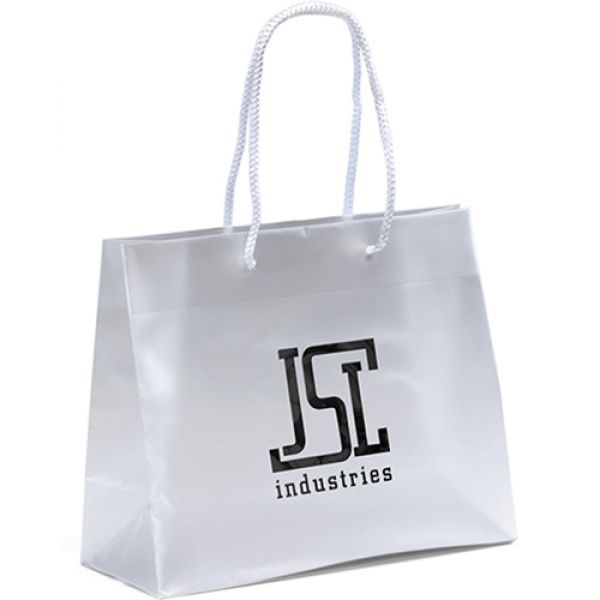 This elegant hi-density 3.5 mil frosted plastic bag features 16"-long macramé handles, reinforced fold-over top, and cardboard bottom insert. Price includes foil stamp.