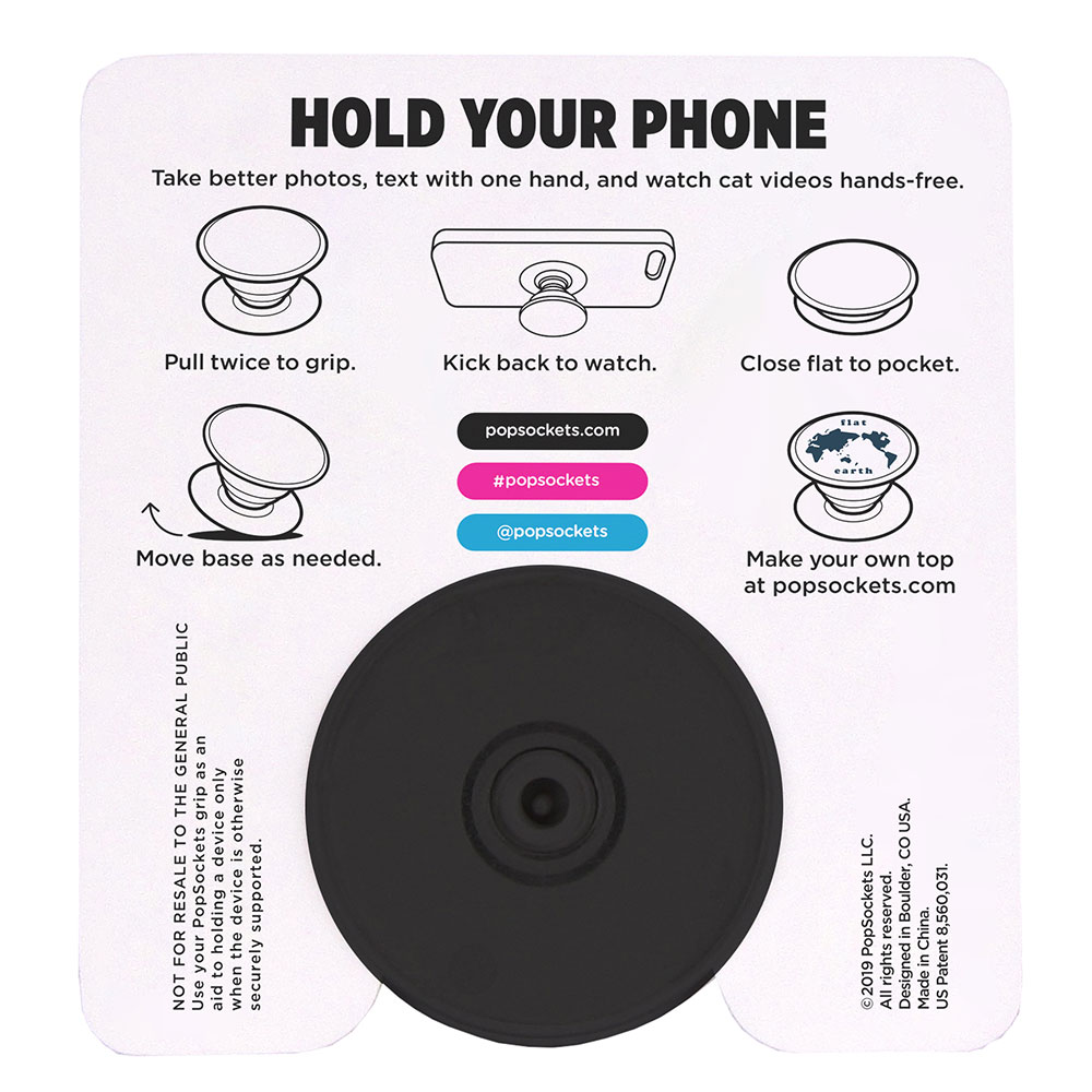 The new PopGrip - Swappable makes it easy to remove the PopTop from the base to charge your phone wirelessly. Like a classic PopGrip, the PopGrip - Swappable sticks flat to the back of your phone with a repositionable gel. Once extended it becomes a media stand and grip. Making it easier to text with one hand, snap photos, and watch videos hands-free. *For best results, use in conjunction with a phone case. The PopGrip's gel is designed to stick to most materials, but it may have issues sticking to silicone, waterproof cases and textured materials, like leather. Material: Plastic. Price includes one color, one location imprint.