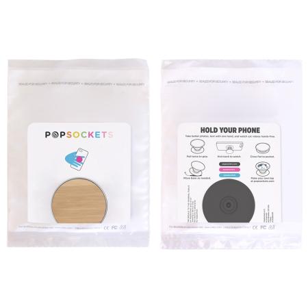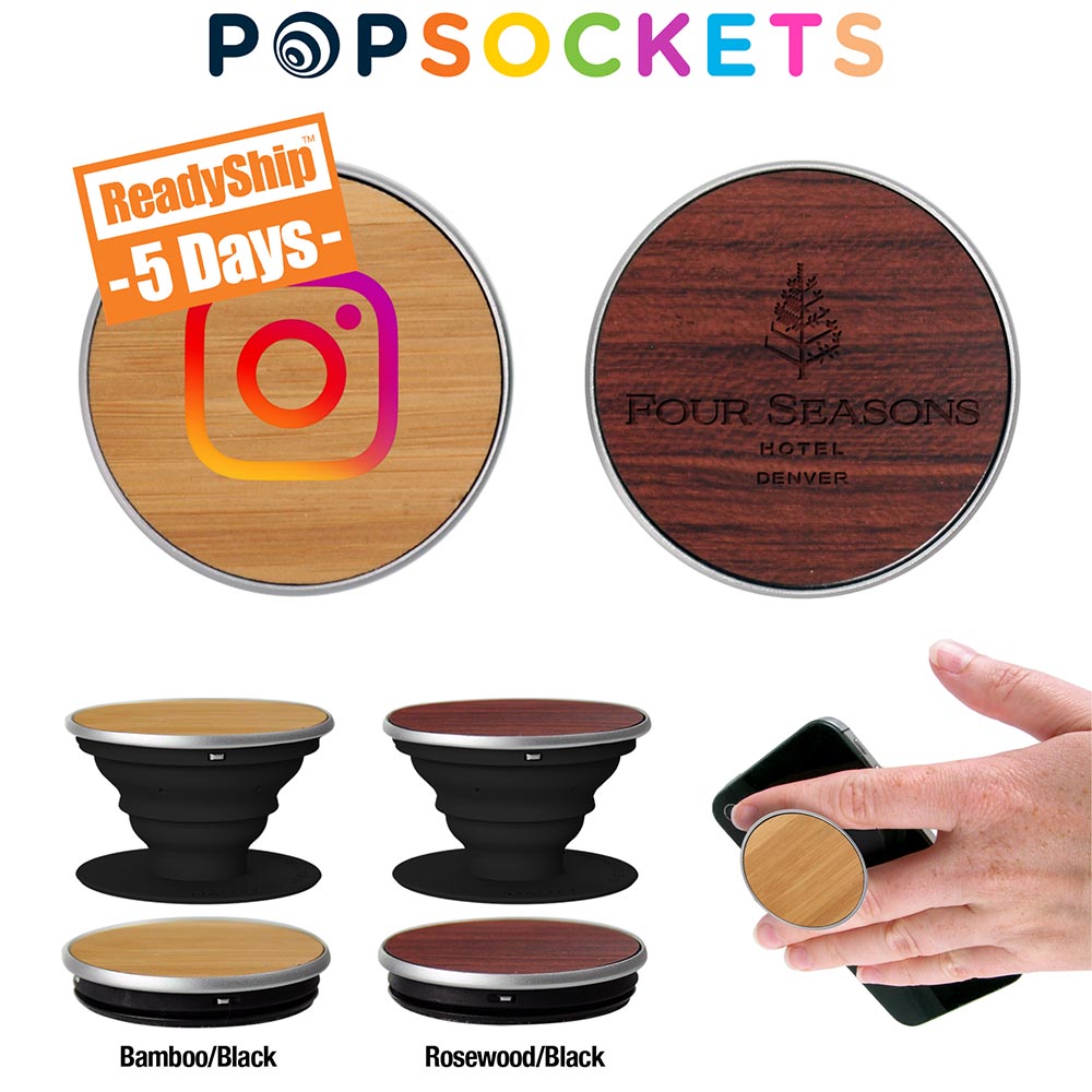 It just keeps getting better! Introducing the PopGrip - Wood! Available in Bamboo and Rosewood, the unique wood finish lends perfectly to a classic laser engraving. A PopGrip sticks flat to the back of your phone, tablet or case with its rinsable, repositionable gel. Once extended, a PopGrip becomes a media stand for your device, a photo or texting grip, or lower it for a video chat. The back of anyone's phone is prime real estate for any promotion, and the best part is that a PopGrip can be used on almost any brand of phone or phone case. *For best results, use in conjunction with a phone case. The PopGrip's gel is designed to stick to most materials, but it may have issues sticking to silicone, waterproof cases and textured materials, like leather. Material:Plastic, Aluminum, Wood.