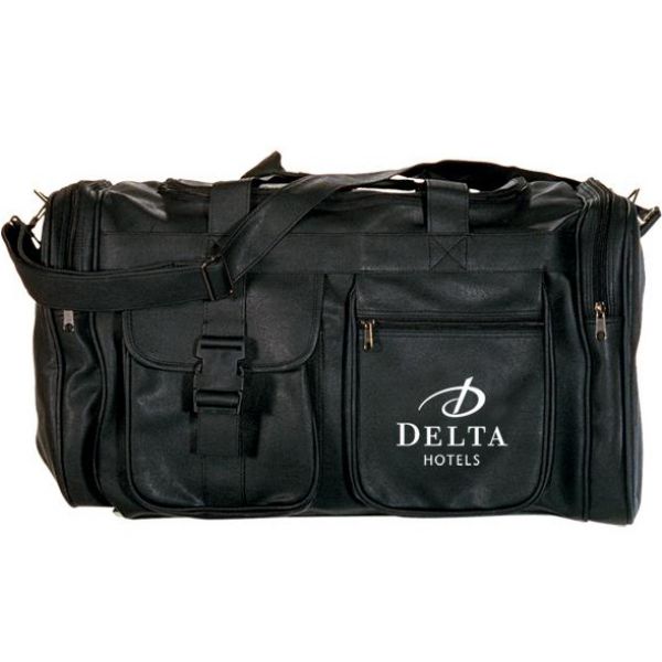 Koskin material Promotional Duffel Bag designed with two front pockets (8" W x 9.5" H x 1" D) one zippered and one with a buckle closure. Minimum order of 35 pcs. Black colour in stock. Embroidery and screen print method. Free art proof. 8" x 5" imprint area. Each Custom Duffel Bag comes with two end zippered pockets and a "U" shaped top zipper closure. Sewn-in hard bottom base with five bottom feet. Bag has an adjustable/detachable shoulder strap with metal hardware. Price includes one colour imprint, one location. Product measures 13" x 22" x 12" - 2.93 lbs. rushIMPRINT it!