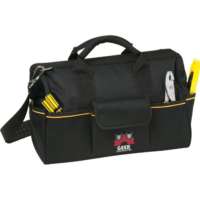 For any handy man who needs to fix any small or large task. Made of durable and water resistant 600D Polyester, features stable gatemouth design with heavy duty zipper with wide opening, wire reinforced rim contains 12 inside tool pockets, 8 outside tool pockets plus an additional 2 velcro outside pockets, rubber feet for stability, removable adjustable shoulder strap for transport and padded handles for additional comfort. (Tools not included). Price includes one colour imprint, one location.