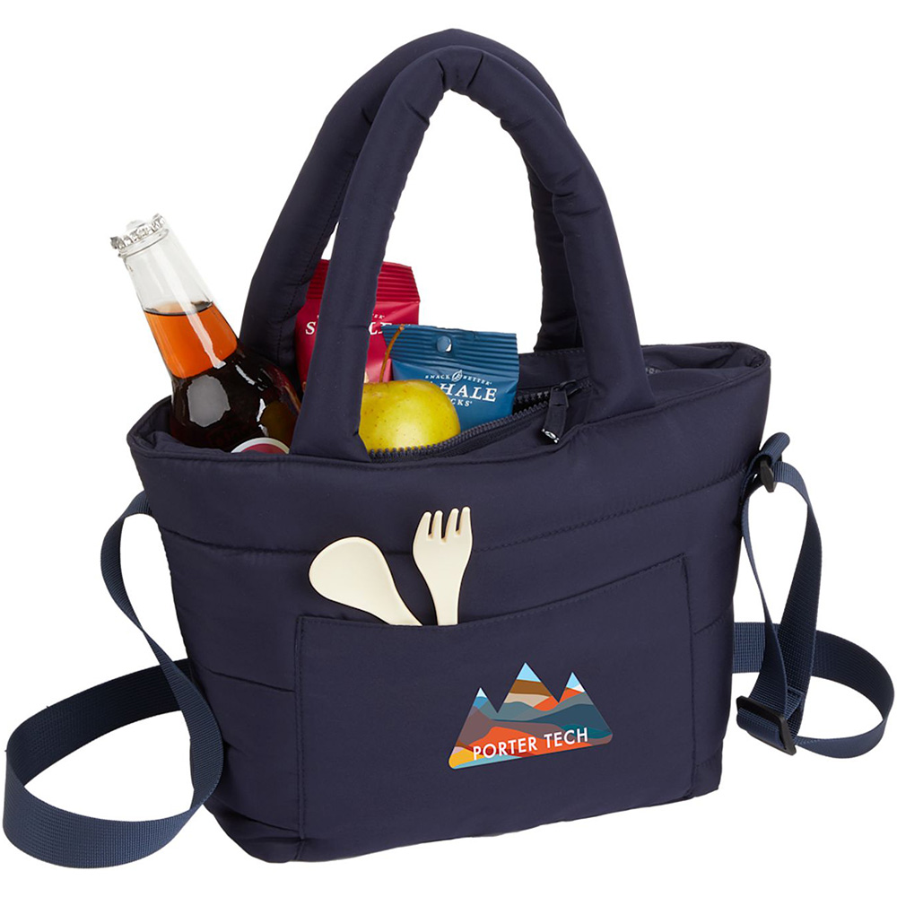 The Puffer Tote Cooler is the perfect size to keep your food chilled for picnics at the park, or groceries cool on the way home from the store. Crafted from quilted rPET, this tote cooler has a super soft, puffy exterior. The sturdy quilted handle and matte finish add a touch of luxury, and the ultra-lightweight design feels like you're carrying a cloud. Featuring a large zippered main compartment for easy access, with a PEVA lining for added durability and insulation. A front slash pocket provides additional storage, the large, quilted grab handles provide a comfortable grip, and sturdy shoulder strap is adjustable to accommodate whoever is lucky enough to carry it. Super soft, puffy exterior crafted from quilted 300T rPET. Ultra-lightweight design feels like you?re carrying a cloud. Zippered main compartment for easy access, with a PEVA lining for added durability and insulation. Two ways to carry: Soft, quilted grab handles, or adjustable carry strap. Matte finish adds a touch luxury. Front slash pocket offers extra storage. Price includes full colour imprint.