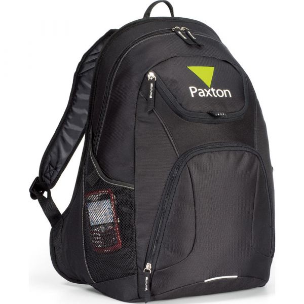 Modern and sporty, this backpack is perfect while on the go. Large main compartment with padded computer sleeve (fits up to 15.4" laptop) and mesh pockets for storage. Front zippered pocket features multi-function organizer. Top zippered pocket stores MP3 player with earphone outlet. Two side mesh pockets for water bottle (water bottle not included) and accessories. Padded, adjustable shoulder straps. 420d dobby polyester material. Price includes one colour imprint, one location.